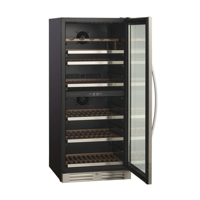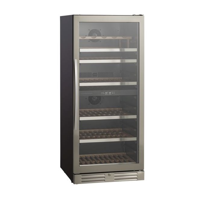 SV 104 X kan användas som ett inbyggt eller fristående vinskåp. Skåpet har två zoner som kan ställas in mellan 5°C – 18°C oberoende av varandra. Skåpet rymmer 90 flaskor fördelade på 6 1/2 hyllor i bokträ med stålförkant, varav 5 1/2 hyllor är utdragbara och en är fast. Ett vackert skåp för att förvara dina flaskor.