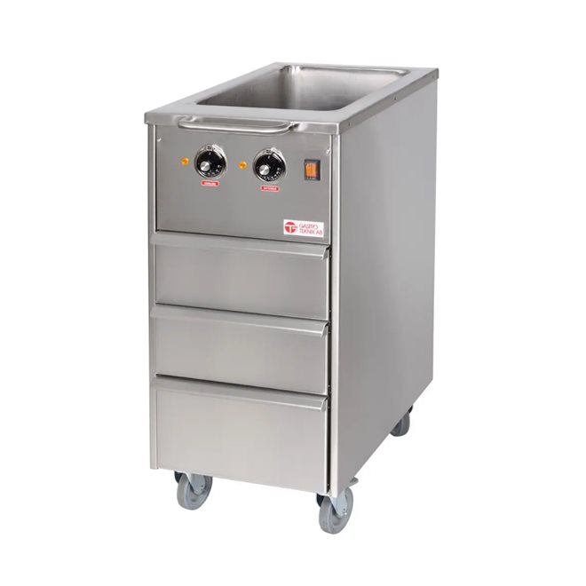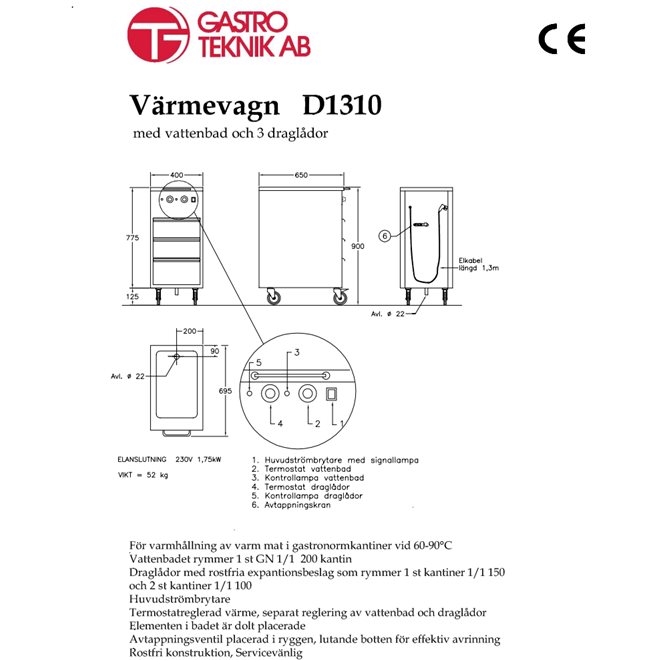 Nettovolym: 100L Försörjningspelaren kan valfritt placeras på höger eller vänster sida Innergryten är tillverkad av syrabeständigt stål Helsvetsad och isolerad grytkropp Litermarkering i grytan Pelare tillverkad av rostfritt Omrörare Inbyggd omrörare utan fogar i matområdet Robust, lätt rörverktyg av rostfritt stål Skrapor av livsmedelsgodkänd värmetålig plast Långsam acceleration/retardation för större säkerhet Omröraren stannar snabbt när locket öppnas Omröraren är skyddad mot överbelastning Ljudnivå i drift: Under 55 dB. Arbetstryck: 1,0 bar Max. ångtemperatur: 120˚ C Inställbar stående kontrollpanel. Liten vattenmängd i ånggeneratorn med värmeelement längst fram i grytan Bottenplatta med tätningar innanför grytans yttermantel Inbyggd säkerhetsbrytare Säkerhetsmutter förhindrar farlig återtippning 24V styrspänning Manometer Tipphöjd: min. 400 mm från golv till underkant av utloppspip Ouppvärmd överkant Gångjärnsförsett rostfritt lock med gasfjäder och ergonomiskt grepp Lock med inspektionshål och tillhörande lock Spärr mot tippning med stängt lock Elektriskt tippning med justerbar TiltBack Felkoder för användarfel och apparatfel Maximal temperatur på grytkroppen efter 3 timmars kokning <40° C Eluppvärmda grytor har automatisk nivåkontroll i ånggeneratorn Arbetshöjd: 900 mm Effekt 21,1kW Strömförbrukning 3x33A Elanslutning 3~400V